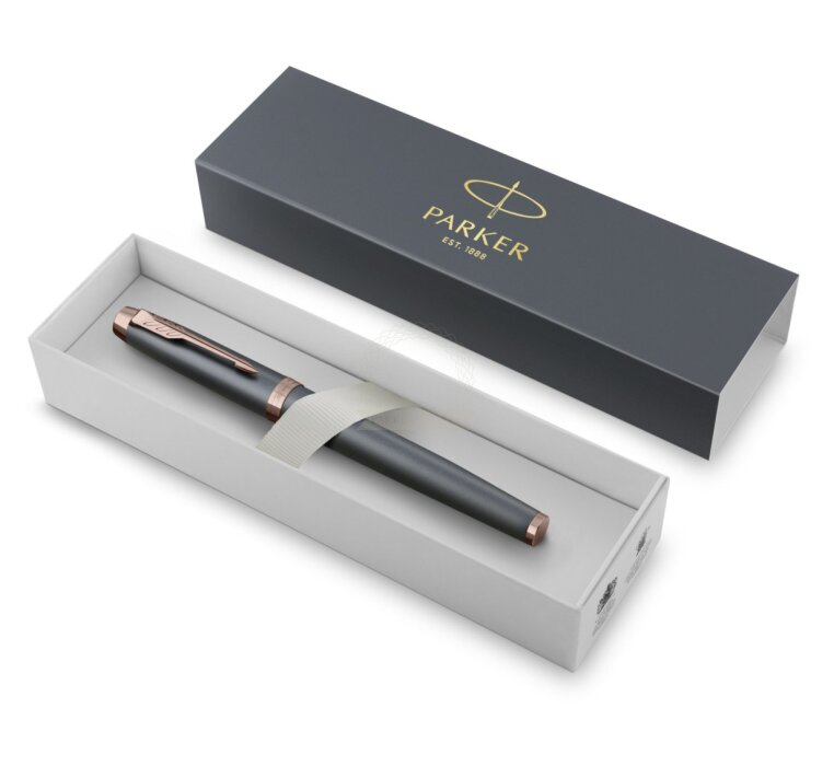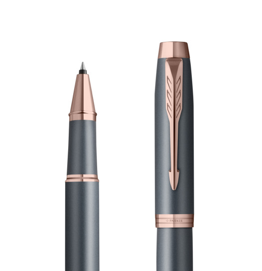 Nutzen Sie jeden Moment der Inspiration mit dem neuesten Begleiter auf Ihrer kreativen Reise – der Parker IM Finishing Touch Kollektion. Ein Premium-Schreibgerät, das für Menschen entworfen wurde, die Schreiben als die höchste Form des Ausdrucks betrachten. Mit ihm wird alltägliches Schreiben zu einem besonderen Erlebnis. Es eignet sich ideal zum Führen eines Tagebuchs sowie zum Festhalten von Gedanken oder Ideen. Jedes Modell ist in drei modernen Ausführungen erhältlich, die zarte Satinfarbtöne mit warmen metallischen Elementen verbinden und so Ihre innere Welt inspirieren. Die Kollektion bietet Personalisierung durch drei Schreibvarianten, von denen jede Komfort, Kontrolle und Langlebigkeit bei langen, intensiven Schreibsitzungen gewährleistet. Geliefert werden sie in einer eleganten Geschenkverpackung – eine inspirierende Geschenkidee für einen geliebten Menschen oder für sich selbst. Das tief graublaue Finish wird durch Details in Roségold akzentuiert.