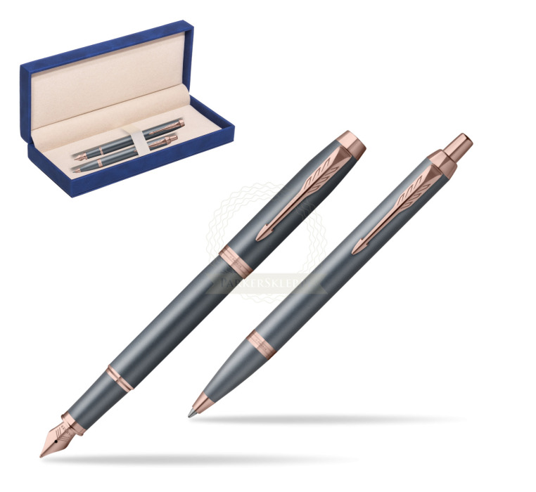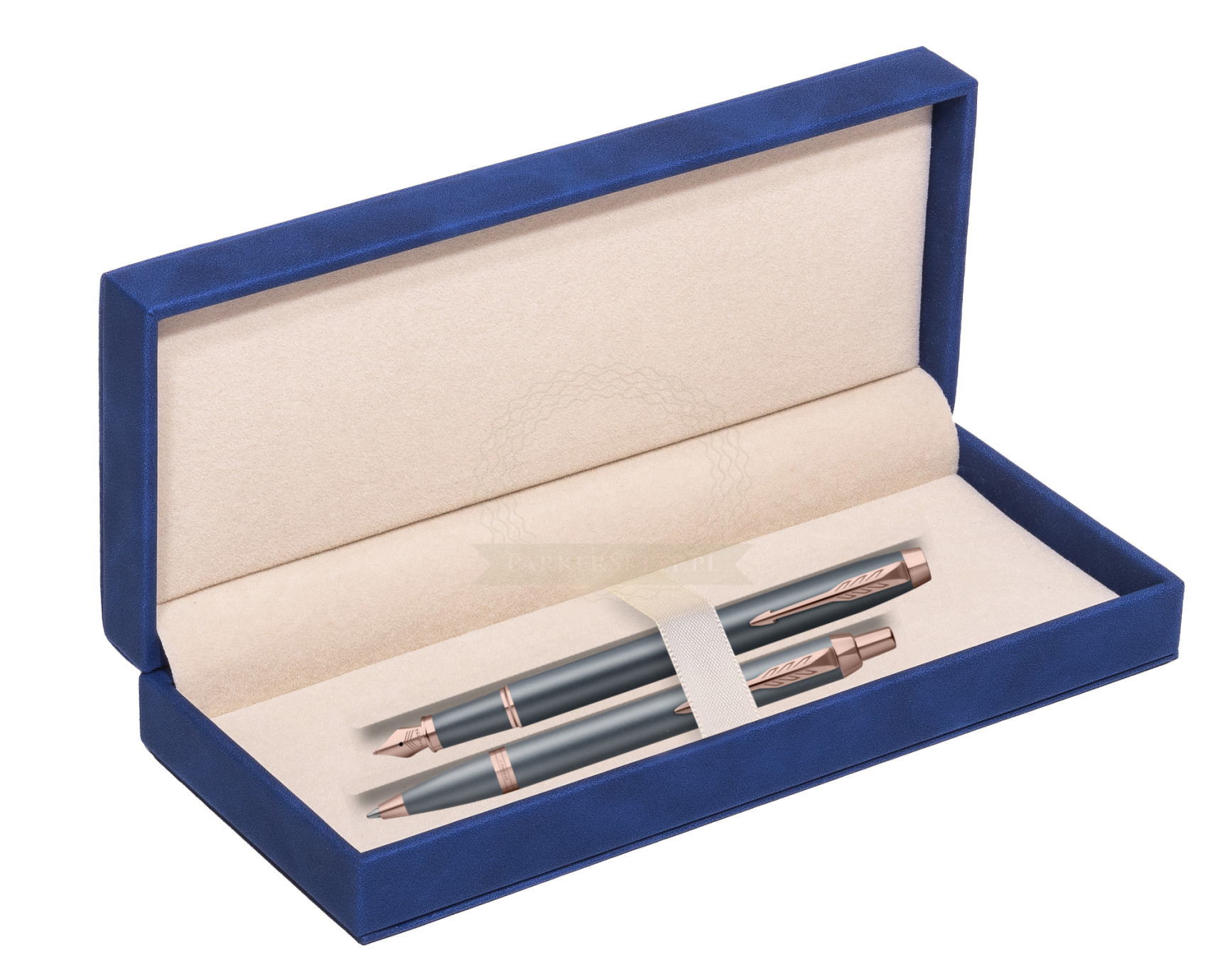 Nutzen Sie jeden Moment der Inspiration mit dem neuesten Begleiter auf Ihrer kreativen Reise – der Parker IM Finishing Touch Kollektion. Ein Premium-Schreibgerät, das für Menschen entworfen wurde, die Schreiben als die höchste Form des Ausdrucks betrachten. Mit ihm wird alltägliches Schreiben zu einem besonderen Erlebnis. Es eignet sich ideal zum Führen eines Tagebuchs sowie zum Festhalten von Gedanken oder Ideen. Jedes Set ist in drei modernen Ausführungen erhältlich, die zarte Satinfarbtöne mit warmen metallischen Elementen verbinden und so Ihre innere Welt inspirieren. Die Kollektion bietet Personalisierung durch drei Schreibvarianten, von denen jede Komfort, Kontrolle und Langlebigkeit bei langen, intensiven Schreibsitzungen gewährleistet. Geliefert werden sie in einer eleganten Geschenkverpackung – eine inspirierende Geschenkidee für einen geliebten Menschen oder für sich selbst. Das tief graublaue Finish wird durch Details in Roségold akzentuiert.