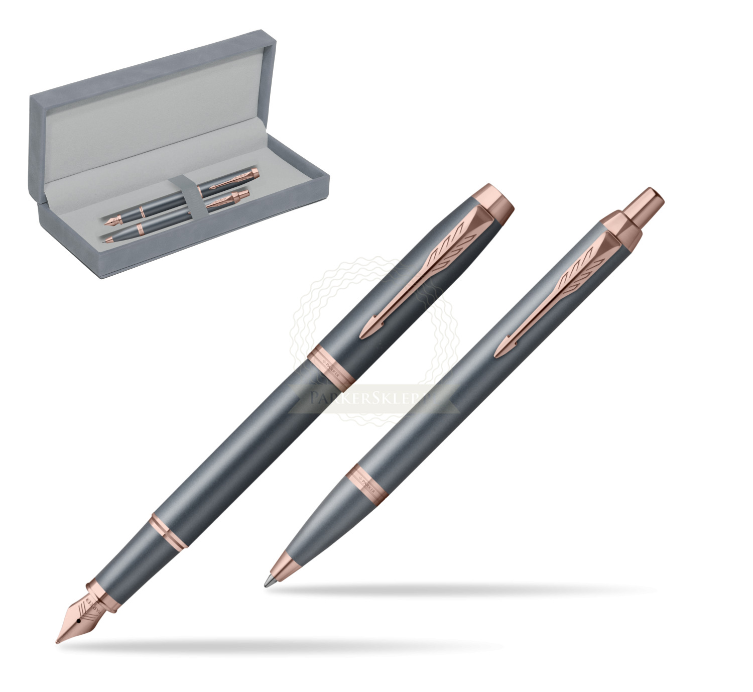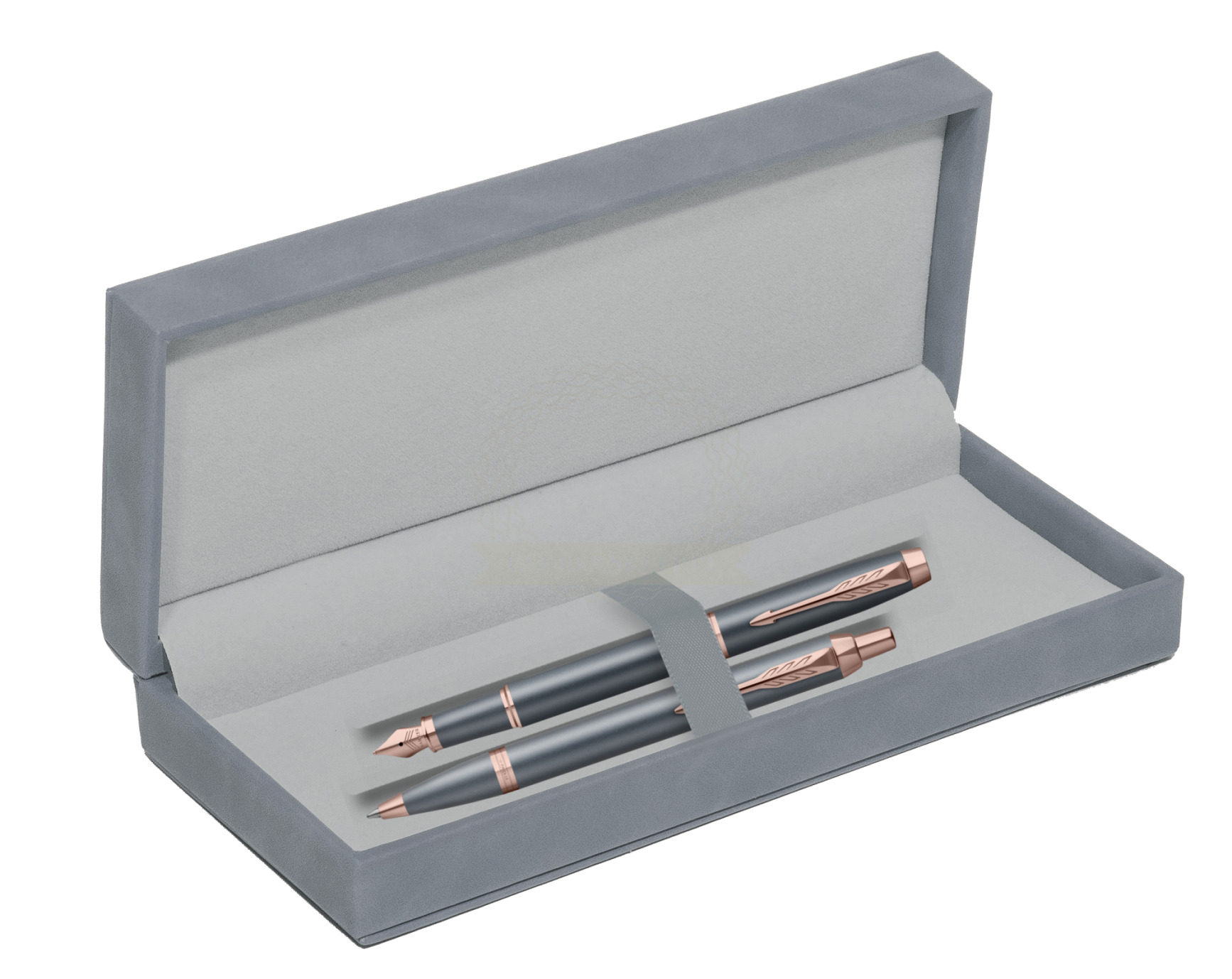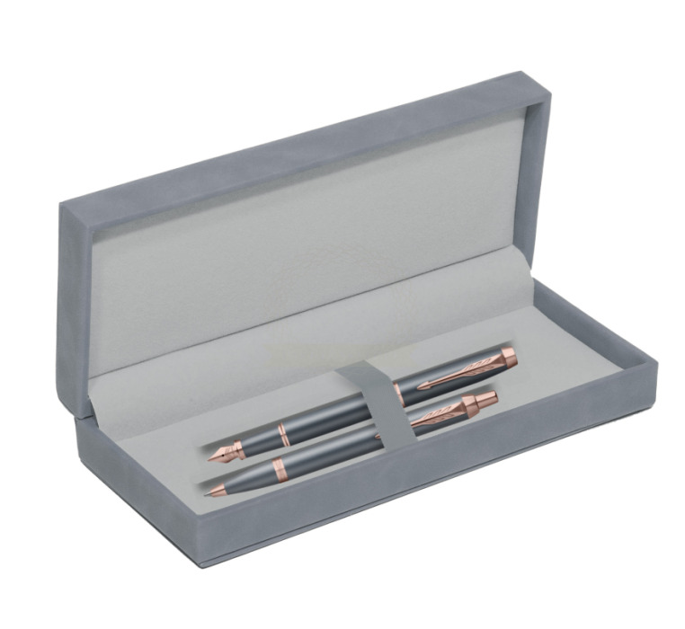 Nutzen Sie jeden Moment der Inspiration mit dem neuesten Begleiter auf Ihrer kreativen Reise – der Parker IM Finishing Touch Kollektion. Ein Premium-Schreibgerät, das für Menschen entworfen wurde, die Schreiben als die höchste Form des Ausdrucks betrachten. Mit ihm wird alltägliches Schreiben zu einem besonderen Erlebnis. Es eignet sich ideal zum Führen eines Tagebuchs sowie zum Festhalten von Gedanken oder Ideen. Jedes Set ist in drei modernen Ausführungen erhältlich, die zarte Satinfarbtöne mit warmen metallischen Elementen verbinden und so Ihre innere Welt inspirieren. Die Kollektion bietet Personalisierung durch drei Schreibvarianten, von denen jede Komfort, Kontrolle und Langlebigkeit bei langen, intensiven Schreibsitzungen gewährleistet. Geliefert werden sie in einer eleganten Geschenkverpackung – eine inspirierende Geschenkidee für einen geliebten Menschen oder für sich selbst. Das tief graublaue Finish wird durch Details in Roségold akzentuiert.