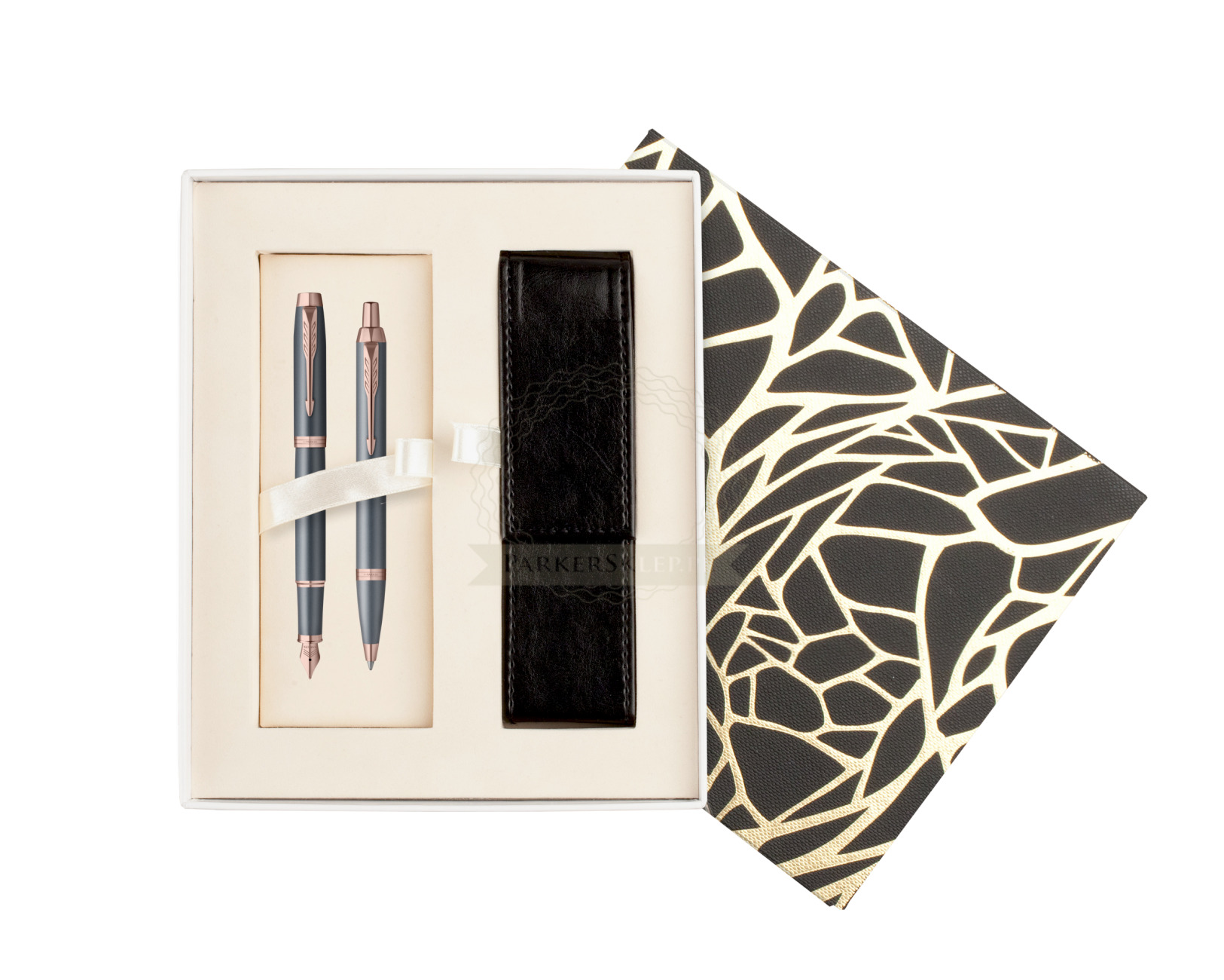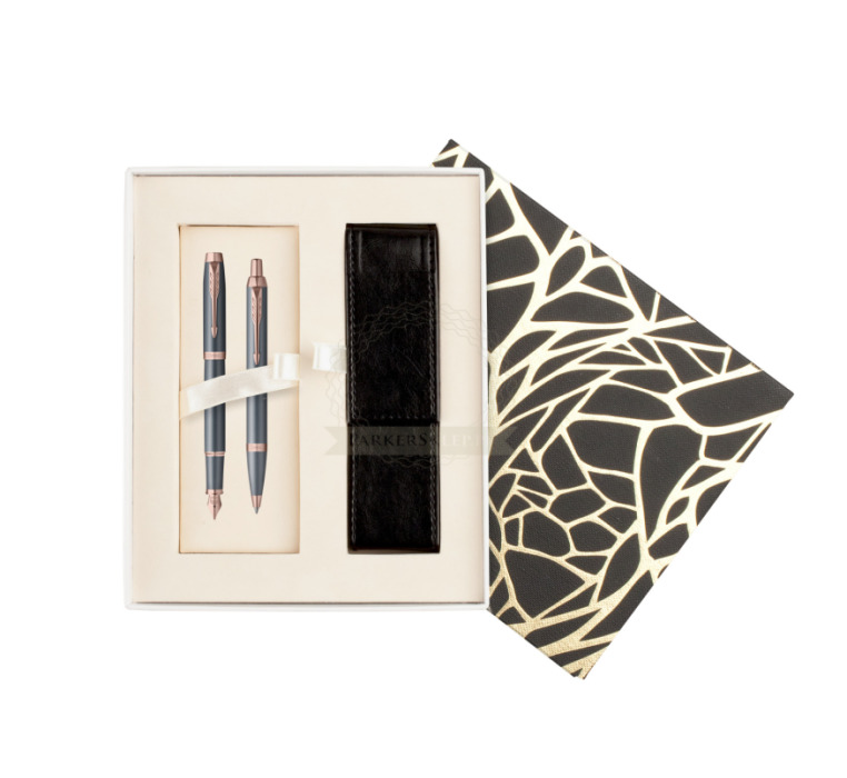 Nutzen Sie jeden Moment der Inspiration mit dem neuesten Begleiter auf Ihrer kreativen Reise – der Parker IM Finishing Touch Kollektion. Ein Premium-Schreibgerät, das für Menschen entworfen wurde, die Schreiben als die höchste Form des Ausdrucks betrachten. Mit ihm wird alltägliches Schreiben zu einem besonderen Erlebnis. Es eignet sich ideal zum Führen eines Tagebuchs sowie zum Festhalten von Gedanken oder Ideen. Jedes Set ist in drei modernen Ausführungen erhältlich, die zarte Satinfarbtöne mit warmen metallischen Elementen verbinden und so Ihre innere Welt inspirieren. Die Kollektion bietet Personalisierung durch drei Schreibvarianten, von denen jede Komfort, Kontrolle und Langlebigkeit bei langen, intensiven Schreibsitzungen gewährleistet. Geliefert werden sie in einer eleganten Geschenkverpackung – eine inspirierende Geschenkidee für einen geliebten Menschen oder für sich selbst. Das tief graublaue Finish wird durch Details in Roségold akzentuiert.