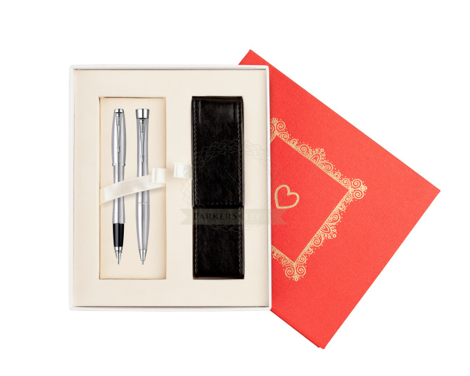 We offer you elegant gift box hand made in red colour, designer for two Parker products. The surface was coated with special subtle red canvas. On the surface repousse with gold pattern in heart shape. This box contains stylish Black case made with PVC leather. Gift box is padded in satin and have elegant gift ribbons. Closed by magnet.
