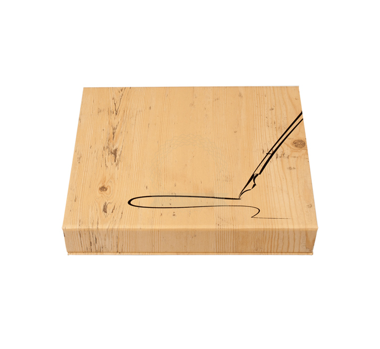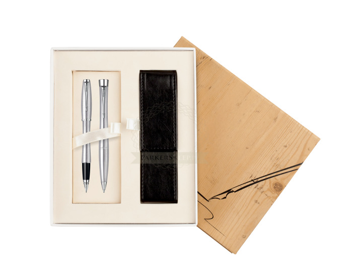We offer you elegant gift box hand made with Wood imitating texture , designer for two Parker products. On the surface is overprint. This box contains stylish Black case made with PVC leather. Gift box is padded in satin and have elegant gift ribbons. Closed by magnet.
