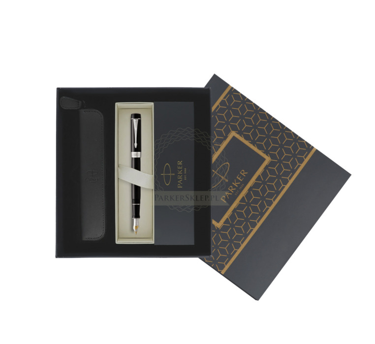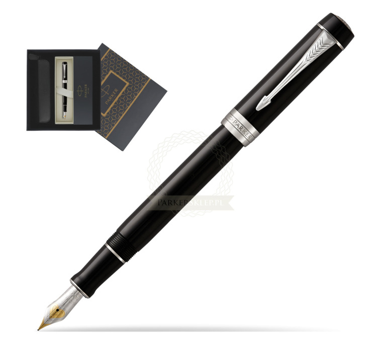 Crafted from solid, velvet black precious resin with highly distinguished, contrasting palladium finish trims. Complemented with an 18k solid gold bi-tonal nib covered with a rhodium highlights. Packaged in a PARKER luxury gift box. One ink cartridge included in random blue or black colour and ink converter.