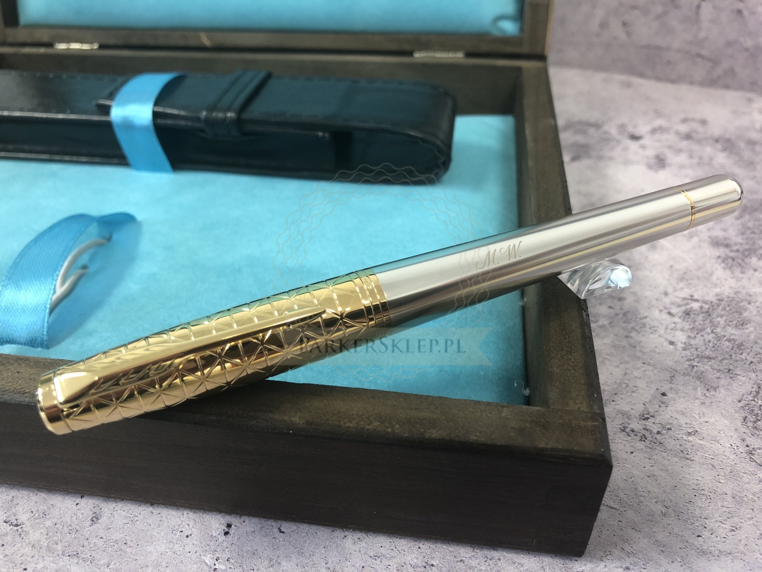 Distinctive style with remarkable performance. The eye-catching Urban takes over a century of Parker tradition into dynamic new territory. With its inimitable curved design and range of finishes, it was crafted to compliment personal style and elevate the confidence behind every word. Parker Urban Premium Aureate Powder GT Fountain Pen is well suited for laser engravings so you can give this pen as a gift for every occasions like Christmas gift or for any anniversary. Every Company can make a realy nice Parker gift out of this for employees or for advertisment purpose. You can refill this Fountain Pen with Parker Ink cartridges or Parker Ink in bottle. On our website you can find Rollerball Pen and Ballpoint Pen matching the set. Grey anodized aluminum material rhythmed by a modern pattern etched with timeless graphic tones. Glossy engraved gold finish cap. Complemented with gold PVD trims. Packaged in a Parker gift box. This Fountain Pen comes with nib size F. One ink cartridge included in random blue or black colour.