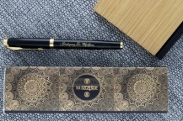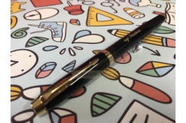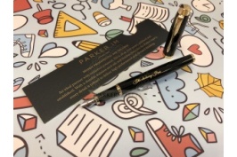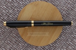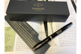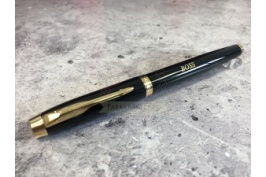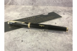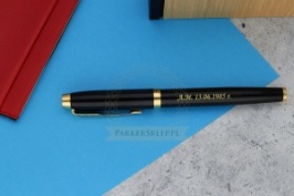 Glossy black lacquer complemented with gold finish trims. Packaged in a Parker gift box. This Fountain Pen comes with nib size F or M. One ink cartridge included in random blue or black colour.