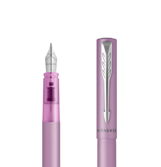 Stylish design meets reliable performance, Vector XL Fountain Pen suits any modern lifestyle. The metallic matte lilac finish is complemented by chrome trims and the signature PARKER arrow clip. Featuring a unique transparent shell revealing the inner workings of the pen. The durable, large stainless steel nib delivers a comfortable and consistent writing experience. Presented in a PARKER gift box, it is the perfect gift for students and young professionals looking for a modern and high-quality pen, benefitting from Parker’s expertise in fine writing. Durable, large stainless-steel nib delivers a comfortable and consistent writing experience. Metallic lilac black finish complemented by chrome trims and the signature PARKER arrow clip.