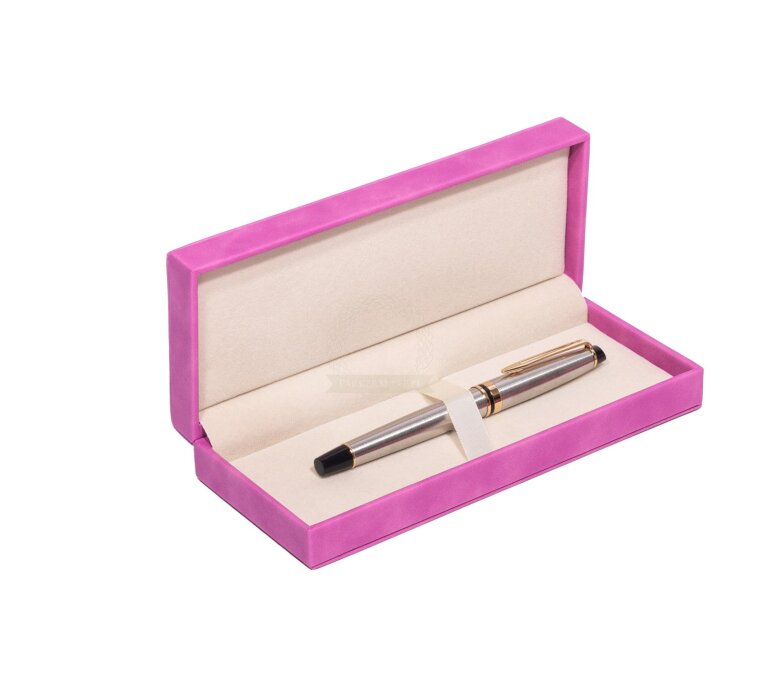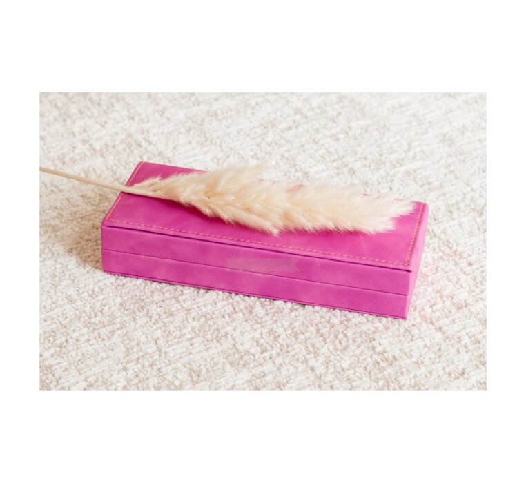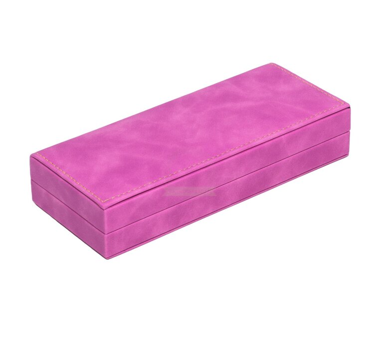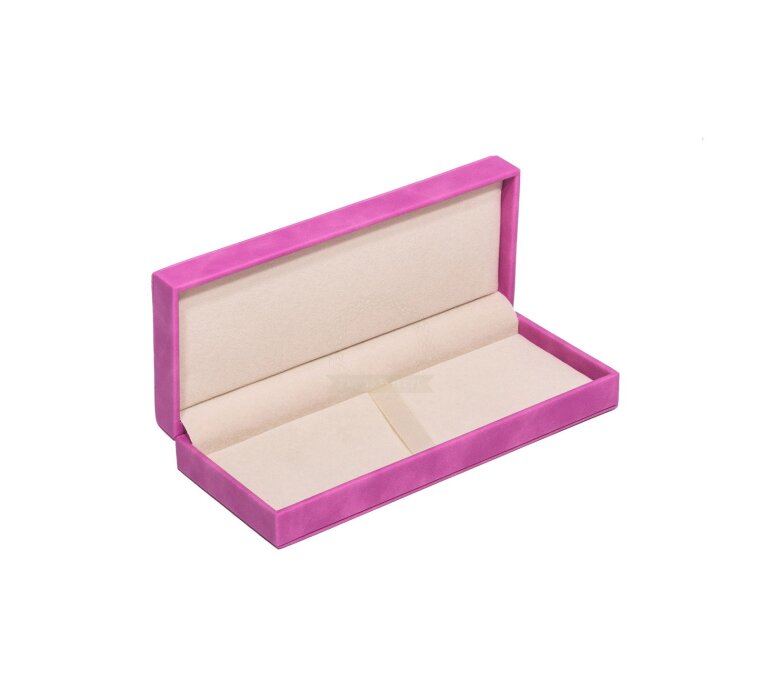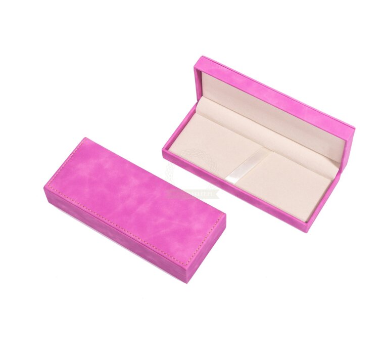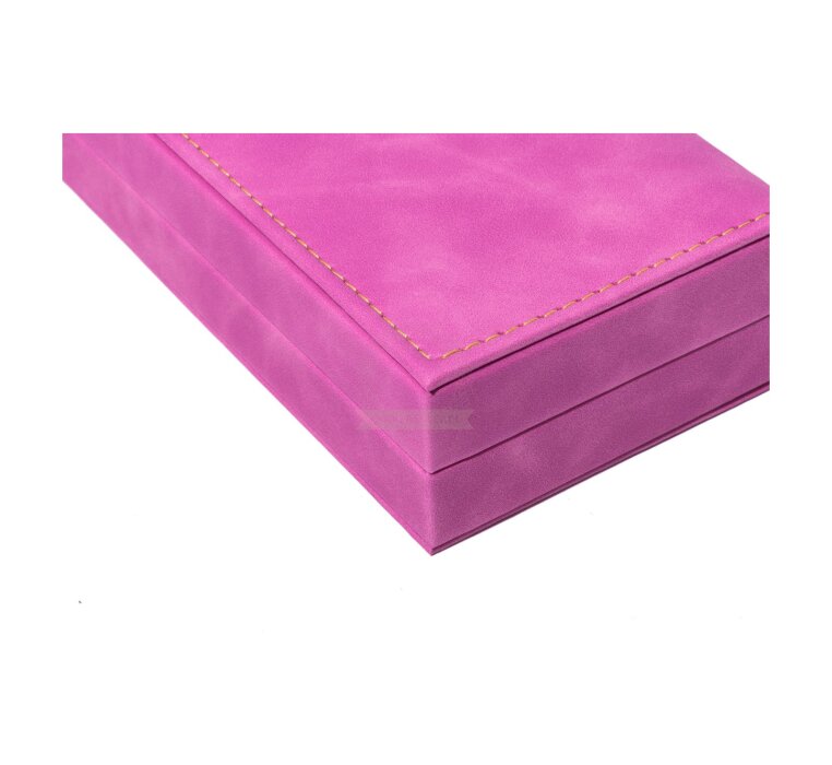 An elegant gift box made of hard plastic, covered with a soft layer of suede both on the outside and inside. Pink suede on the outside. A box for 1 or 2 products.