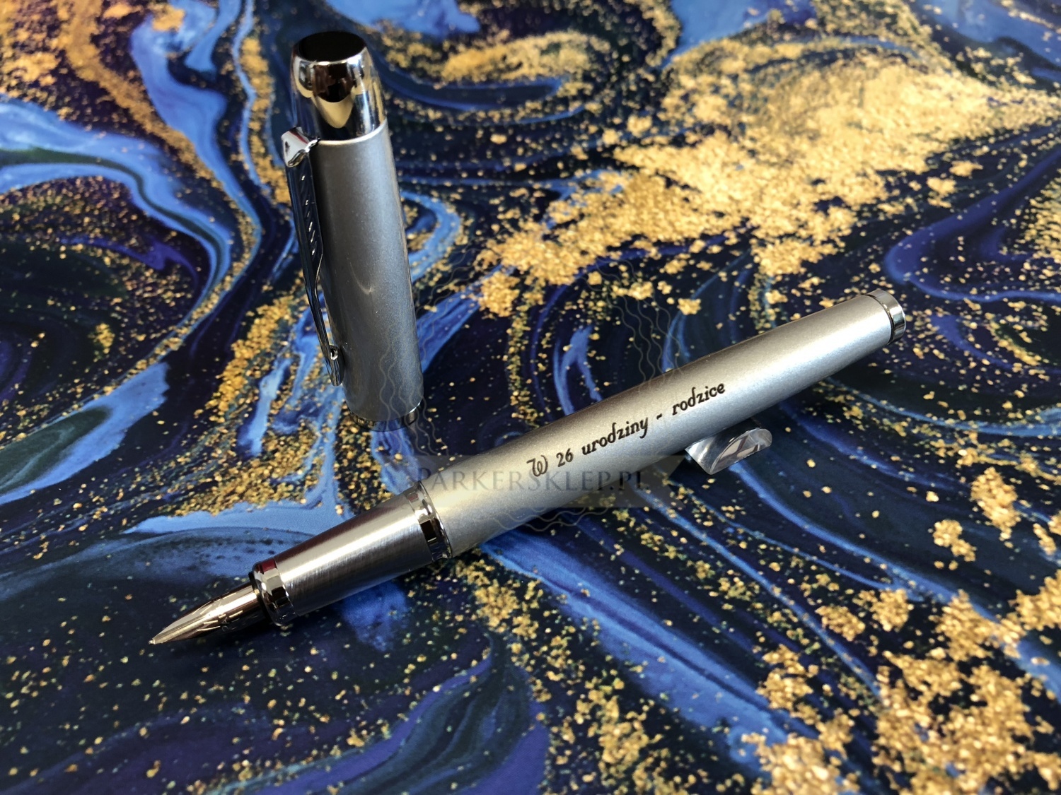 We offer to You Parker special gift box which contains Parker IM Silver CT Fountain Pen + Parker IM Silver CT Ballpoint Pen. Parker IM, with its smart choice of high quality finishes, matches just about any style or mood you’re in. Focused on comfort and simple, high-performance functionality, its tapered contemporary shape teams up with the versatile appeal of metal to give instant modern style from PARKER. Set is ideal as a gift for everyone on all kinds of occasions like birthdays or as a Parker Christmas gift. This set is perfect for all companies who wants to give Parker gifts for their employees, partners or investors. Once you feel the grace and fluidity in writing of this product you can get Rollerball Pen matching to the set. This Parker Fountain Pen can be refilled with every Parker Ink cartridges or by Parker Ink in bottle. Parker Ballpoint Pen can be refilled with every Parker Ballpoint refill and Fountain Pen can be refilled with Parker Ink in bottle or Ink cartridges. In shiny, chrome metal finish with chromed trims. Quinkflow® technology for a smoother, cleaner & more consistent writing performance, in a word the greatest PARKER ballpoint ever. Nib in stainless steel for superior resistance and durability. Designed to provide an optimal writing angle for both right- and left-handed writers. This Parker Ballpoint Pen comes with a Ballpoint refill is in random colour Black or blue and blue Fountain Pen Ink cartridge. Presented in its PARKER special gift box designed for two Parker products.
